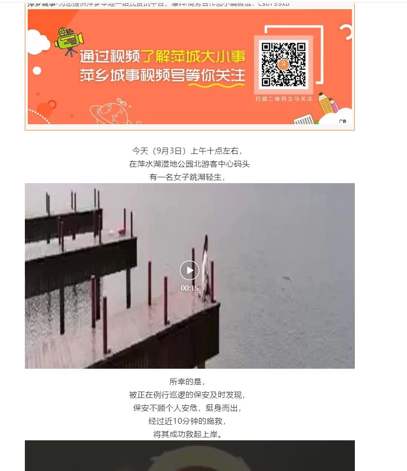 當(dāng)天下午,萍鄉(xiāng)本地新媒體萍鄉(xiāng)城事對(duì)事件進(jìn)行了報(bào)道,感謝所有參與施救的人員。 萍鄉(xiāng)市開(kāi)發(fā)區(qū)園林局朱局長(zhǎng)親臨萍水湖濕地公園,特別表?yè)P(yáng)了班長(zhǎng)鄧友國(guó)挺身而出,勇于救人的行為。