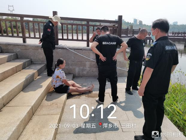 9月3日上午10點(diǎn)左右,領(lǐng)威保安駐萍水湖濕地公園項(xiàng)目保安員陳海軍在萍水湖濕地公園北游客中心碼頭正常巡邏時(shí),發(fā)現(xiàn)一名女子坐在碼頭邊上,疑似有輕生念頭。保安員陳海軍立即上前準(zhǔn)備詢(xún)問(wèn),被該女子制止。陳海軍見(jiàn)此情景,馬上通過(guò)對(duì)講機(jī)和微信工作群聯(lián)系當(dāng)班班長(zhǎng)和隊(duì)長(zhǎng)。當(dāng)班班長(zhǎng)譚志剛、鄧友國(guó)得知消息后立刻報(bào)警,并迅速趕往現(xiàn)場(chǎng)。班長(zhǎng)鄧友國(guó)趕到時(shí),發(fā)現(xiàn)該女子已經(jīng)跳入湖中,如果不及時(shí)救援,該女子就會(huì)有生命危險(xiǎn)。班長(zhǎng)鄧友國(guó)急忙打開(kāi)碼頭消防柜,拿著救生圈果斷地跳入湖中,游到該女子身邊進(jìn)行水中施救。經(jīng)過(guò)近10分鐘的施救,該女子被成功拖到岸邊,上岸后,區(qū)域總監(jiān)易衛(wèi)華、隊(duì)長(zhǎng)張繁榮組織保安員將該女子圍住,以防止該女子再有輕生行為。待女子情緒稍微安定后,易總開(kāi)始對(duì)女子進(jìn)行耐心勸解,并將其帶到陰涼處休息,等待當(dāng)?shù)嘏沙鏊窬瘉?lái)處理。