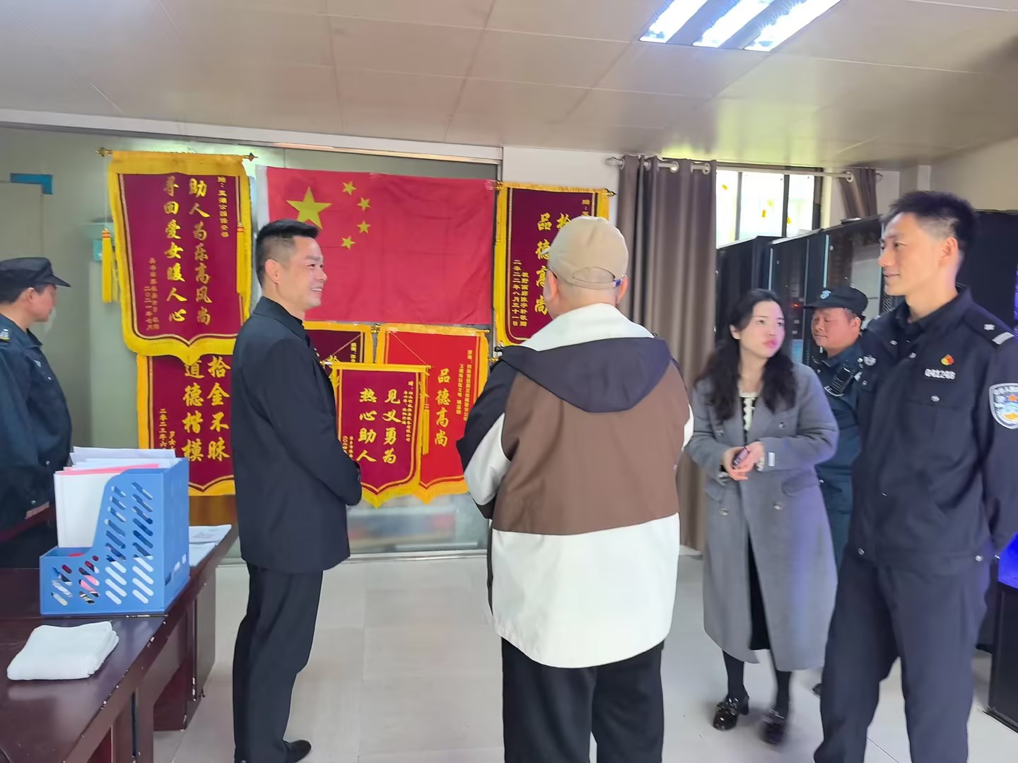 3月14日,在我公司萍鄉(xiāng)玉湖項(xiàng)目現(xiàn)場,上演了一幕莊重而溫馨的場面。萍鄉(xiāng)市公安局治安警察支隊(duì)內(nèi)保大隊(duì)長危湘,萍鄉(xiāng)市保安行業(yè)協(xié)會秘書長鄧宗淼,萍鄉(xiāng)市保安行業(yè)協(xié)會辦公室主任盧寒親自前來,為李興萍、歐陽開福兩位保安員送上了錦旗和慰問金。這面錦旗,是萍鄉(xiāng)市保安行業(yè)協(xié)會自成立以來的第一面錦旗,更是市局內(nèi)保大隊(duì)長首次出面贈送的榮譽(yù),它不僅僅是對兩位保安員英勇行為的贊揚(yáng),更是對整個領(lǐng)威安保團(tuán)隊(duì)工作的肯定,意義非凡。