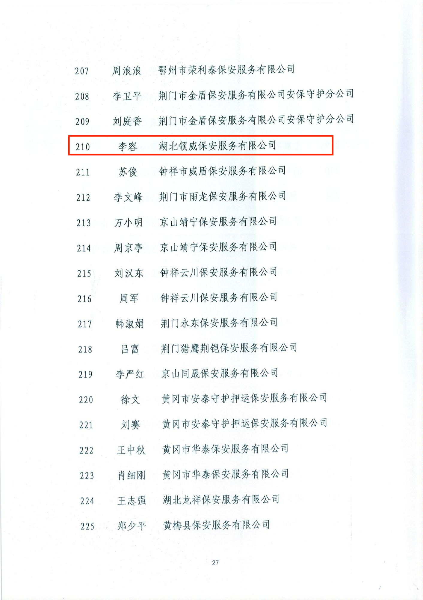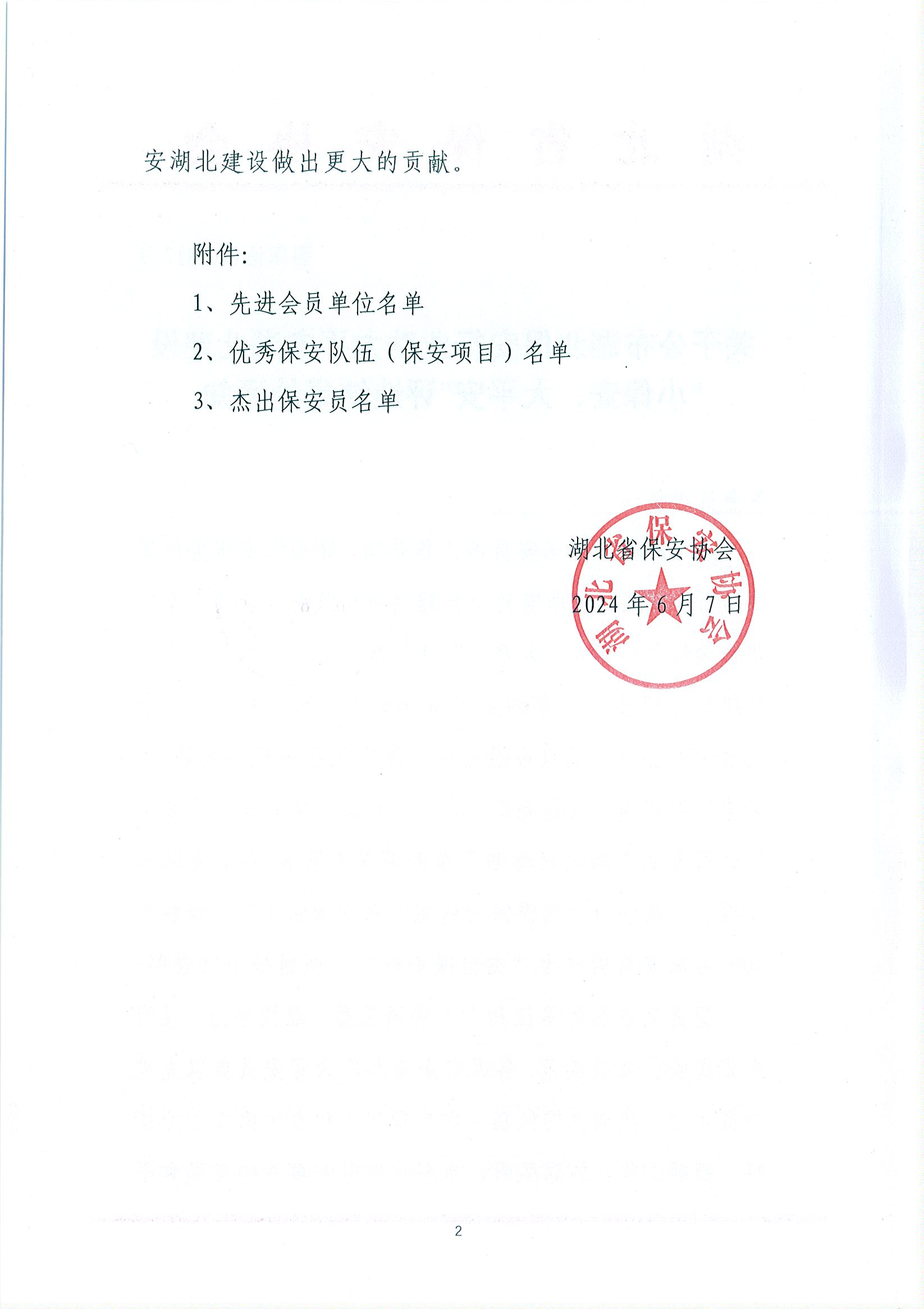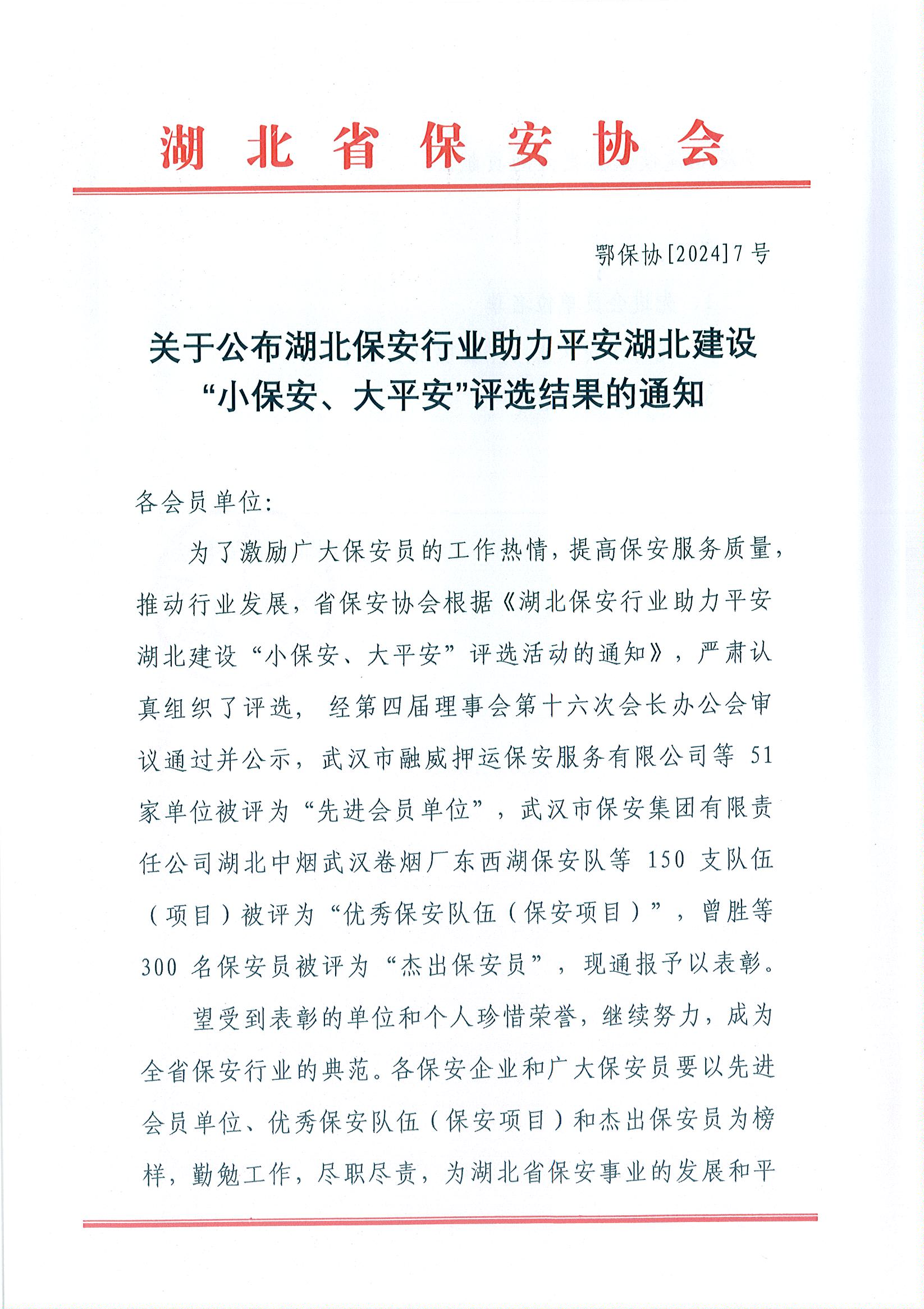 在平安湖北建設(shè)“小保安、大平安”評(píng)選活動(dòng)中,我公司榮獲“先進(jìn)會(huì)員單位”殊榮,荊門龍山世茂保安隊(duì)榮獲“優(yōu)秀保安隊(duì)伍”稱號(hào),李容同志榮獲“杰出保安員”榮譽(yù)。以上成績(jī)均獲得湖北省保安協(xié)會(huì)的通報(bào)表彰,特此喜報(bào)!